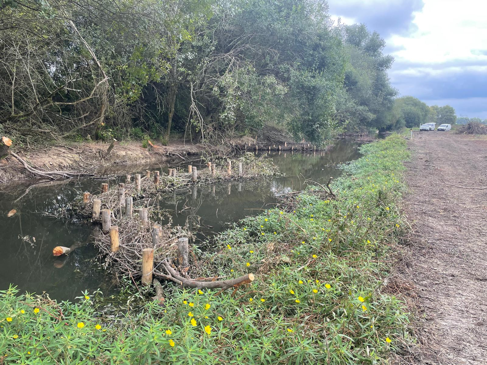 Il s’agit des alignements de pieux tressés de branches de saules qui sont installées dans le lit en forme de banquette. Grâce aux crues qui vont venir les combler de sables, ces aménagements vont accélérer le processus de sédimentation en créant une sorte de nouvelle berge qui va resserrer les écoulements et redonner une dynamique au ruisseau.